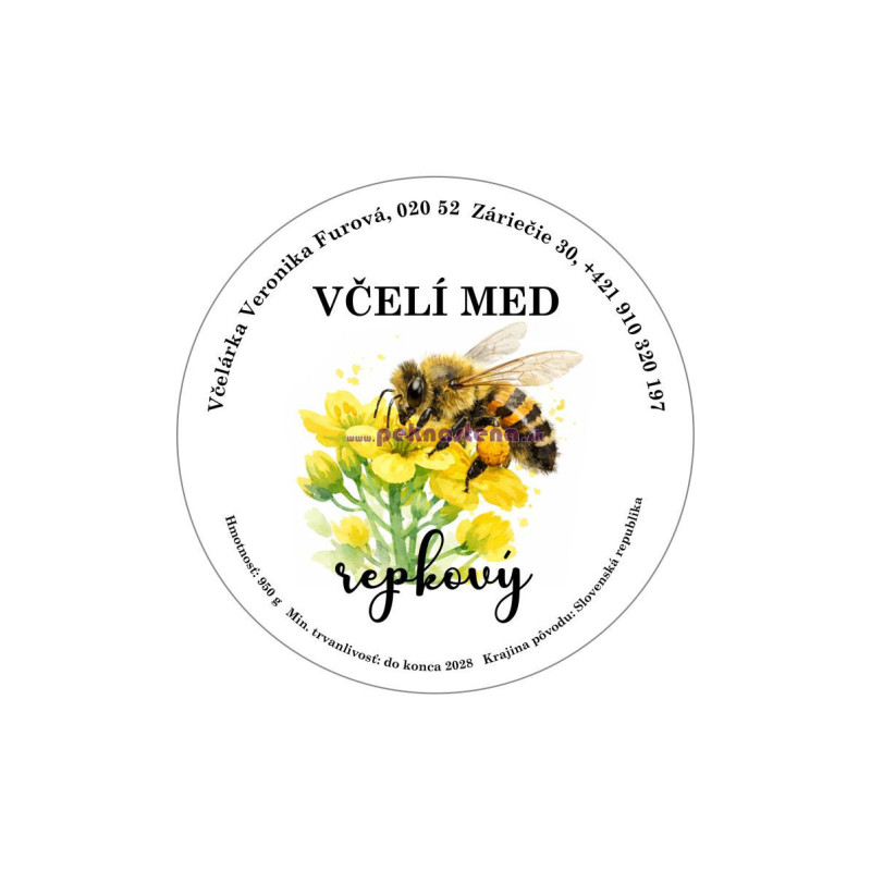 Okrúhla biela etiketa s označením Včelí med repkový. Etikety sú tlačené vo vysokej kvalite na samolepiacu PVC fóliu. Minimálny odber je 10ks.